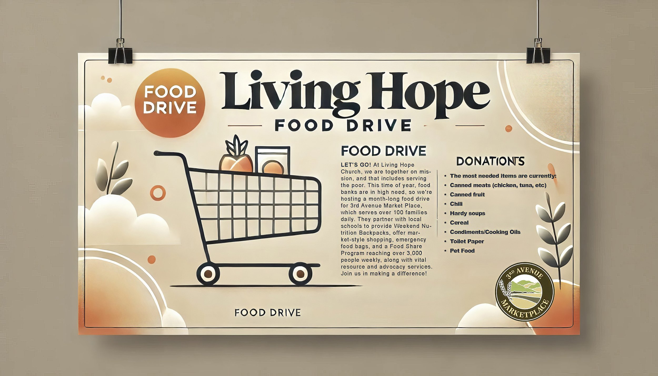 LET'S GO!! At living hope church, we are together on mission, and that includes serving the poor. During this time of year, food banks in our community are in high need of donations. We are excited to serve our neighbors by hosting a month-long food drive for 3rd Avenue Market Place.